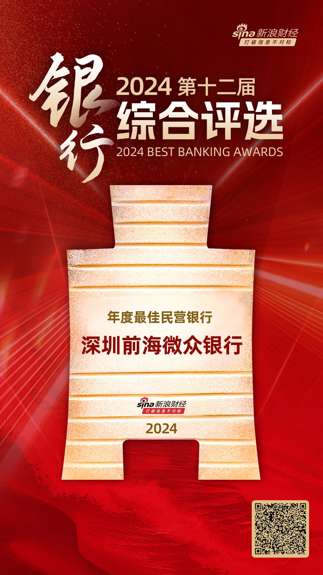 1月23日金融一线消息,由新浪财经主办的“2024(第十二届)银行综合评选”活动获奖名单今日正式揭晓!深圳前海微众银行获评“年度最佳民营银行”。