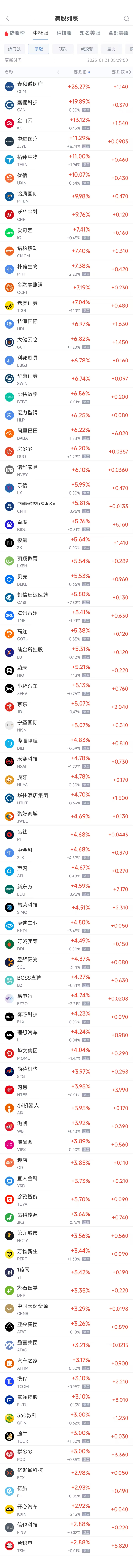 上涨股当中(按市值降序排列),台积电涨2.88%,阿里巴巴涨6.22%,拼多多涨3.00%,网易涨3.95%,京东涨5.07%,携程涨3.10%,百度涨5.76%,理想汽车涨4.20%,贝壳涨5.53%,日月光半导体涨2.54%,腾讯音乐涨5.41%,中通涨2.80%,小鹏汽车涨5.13%,联电涨1.74%,富途控股涨3.10%,满帮涨2.37%,华住酒店集团涨4.70%,蔚来涨5.21%,WSP控股涨0.10%,新东方涨4.59%,唯品会涨3.89%,名创优品涨2.78%,哔哩哔哩涨4.83%,BOSS直聘涨4.27%,360数科涨3.00%,极氪涨5.64%,小马智行涨1.05%。