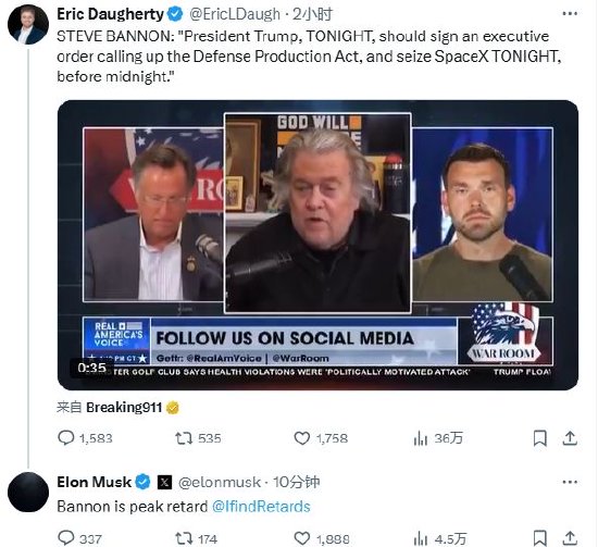 美国总统特朗普的前高级顾问兼首席策略师斯蒂芬·班农 (Steve Bannon)接受采访时称:“特朗普总统今晚应该签署一项行政命令,启动《国防生产法案》,并在今晚午夜之前接管SpaceX。”
