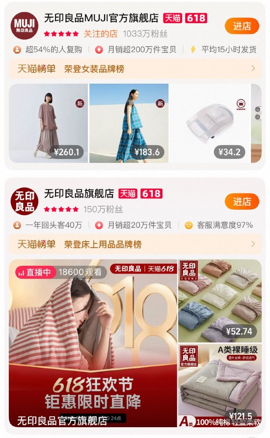 此外,更让消费者困惑的是,一些看似“名正言顺”的旗舰店,竟也与知名正品品牌毫无关联。一位喜爱日式简约风格的网友在“无印良品旗舰店”购买抱枕后大失所望——质量不佳且色彩花哨,与其认知中的无印良品风格迥异。调查后发现,这家坐拥百万粉丝的“无印良品旗舰店”实际由北京某公司运营,与日本无印良品品牌无关,日本正版店铺名为“无印良品MUJI官方旗舰店”。