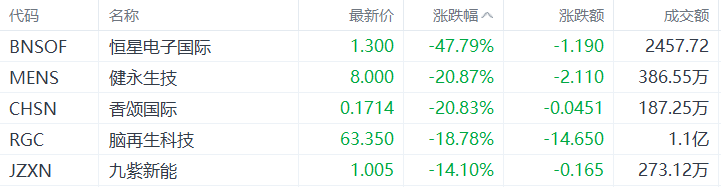 中概股收盘跌幅前五的个股为:恒星电子国际跌47.79%,健永生技跌20.87%,香颂国际跌20.83%,脑再生科技跌18.78%,九紫新能跌14.1%。(格隆汇)