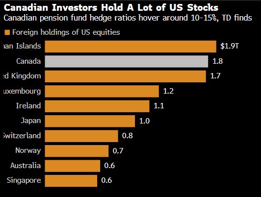 道明团队估计,加拿大养老基金 —— 其中一些基金有明确政策对美国资产非足额对冲 —— 所持仓位的对冲比率约10%至15%。总体而言,加拿大投资者持有约1.8万亿美元的美国股票。分析师写道,对冲比率边际上升5%,可能导致美元兑加元面临约900亿美元的抛售压力。