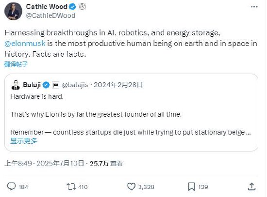 “木头姐”称马斯克是“地球和太空史上最具生产力的人”