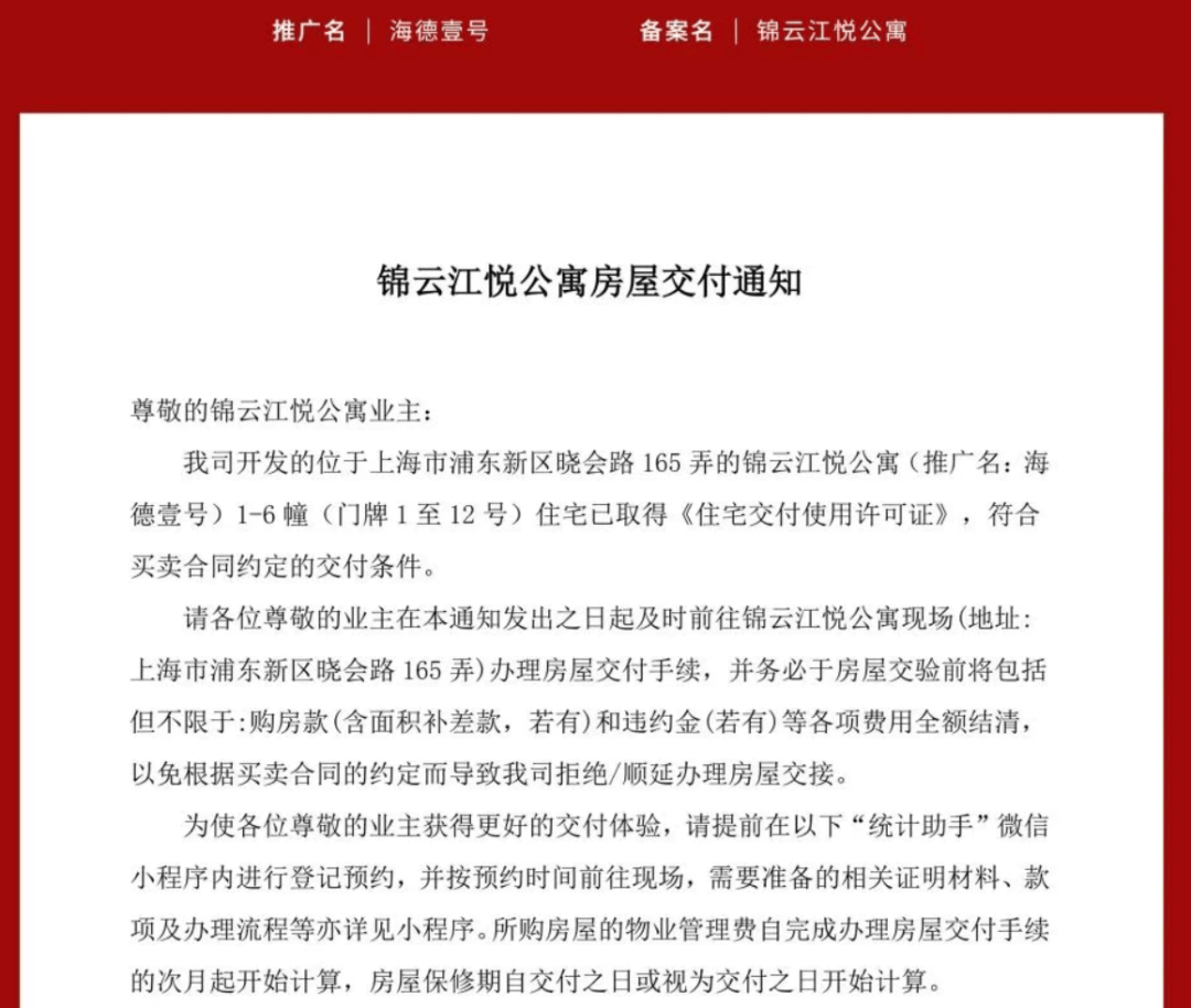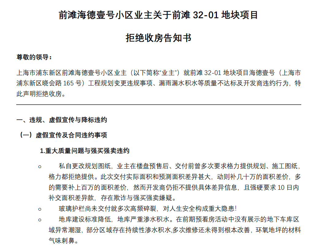 近日,上海浦东新区前滩海德壹号小区业主发出一份《关于前滩32-01地块项目拒绝收房告知书》(以下简称《告知书》),拒绝收房。