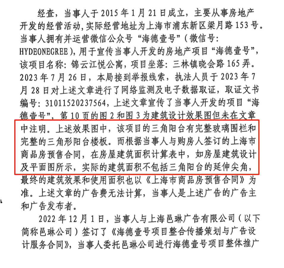 每经记者获取的一份浦东新区市场监督管理局不予行政处罚决定书显示,上海海控保联置业有限公司(即海德壹号项目公司)在2023年7月份发布的一篇项目文章中,建筑效果图的三角阳台有完整玻璃围栏和楼板,而预售合同的实际建筑面积不包括三角阳台的延伸尖角。