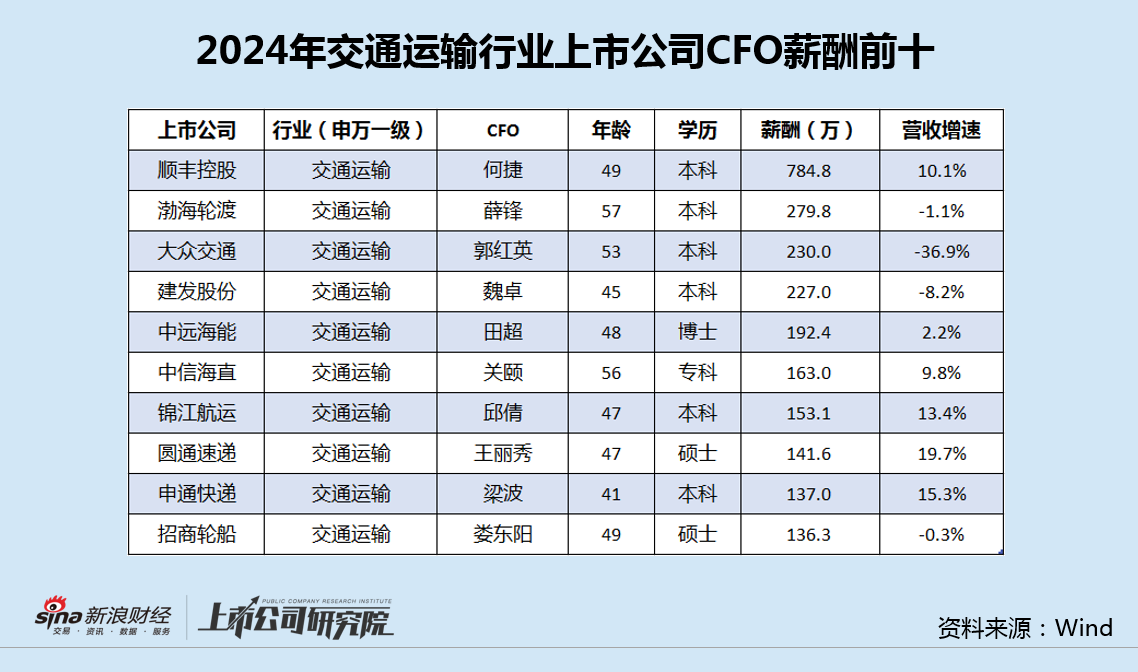 交通运输行业CFO薪酬榜:顺丰控股何捷年薪785万 领先第二名500万、超业内均值10倍