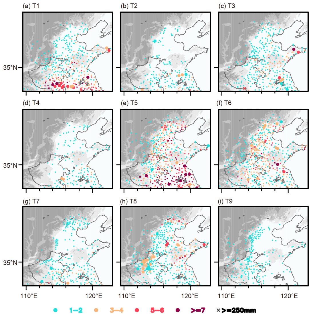 各环流型下极端降水(EP)事件频率。其中X代表至少发生过一次特大暴雨(日降水量超过250mm)的站点。颜色代表EP事件频率,浅灰色阴影表示海拔高于500m但低于1500m, 深灰色阴影表示海拔超过1500m。