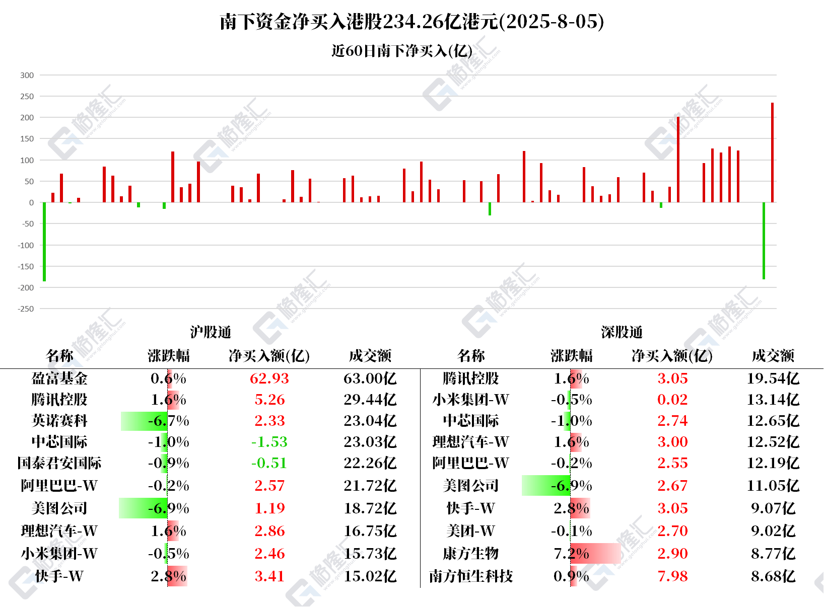 格隆汇8月5日|南下资金今日净买入港股234.26亿港元,创今年3月12日以来单日净买入额新高。其中: