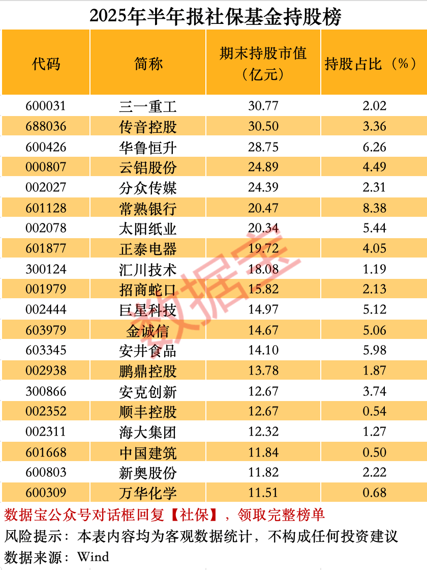 社保基金持股榜:持仓三一重工(600031)近31亿元