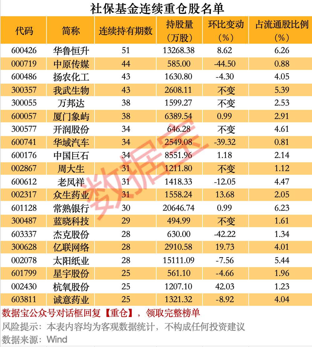 作为风格稳健的长期机构投资者,社保基金长线持有的重仓股更引人关注,据数据宝统计,共有258只股获社保基金连续持有4个季度以上。其中,160只社保基金持有期超过两年,华鲁恒升、中原传媒(000719)等46只获社保基金连续持仓超5年。