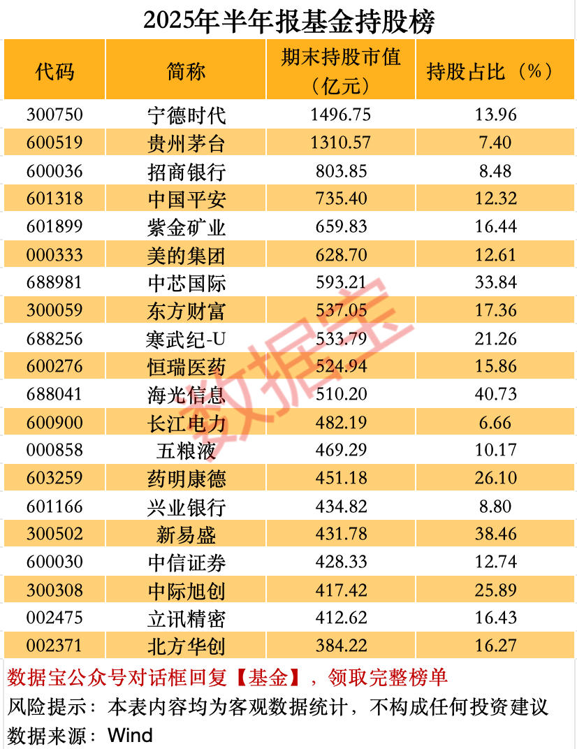数据宝统计的《2025年半年报基金持股榜》显示,117股获公募基金持股市值逾百亿元。宁德时代(300750)、贵州茅台(600519)稳坐排行榜的冠亚军席位。