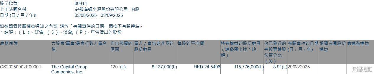 格隆汇9月3日丨根据联交所最新权益披露资料显示,2025年8月29日,海螺水泥(00914.HK)遭The Capital Group Companies, Inc.在场内以每股均价24.5406港元减持813.7万股,涉资约2亿港元。