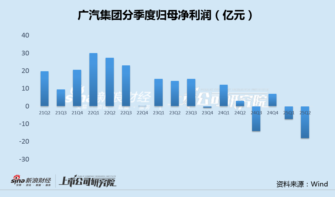 分季度来看,广汽集团第二季度营业总收入为227.3 亿元,同比下降7.9%,归母净利润-18.7亿,相较于2024年同期的3.0亿元以及2025年一季度的-7.3亿元,同环比均呈现加速下滑之势,单季度和半年度的亏损额也都创下了公司历史新高。