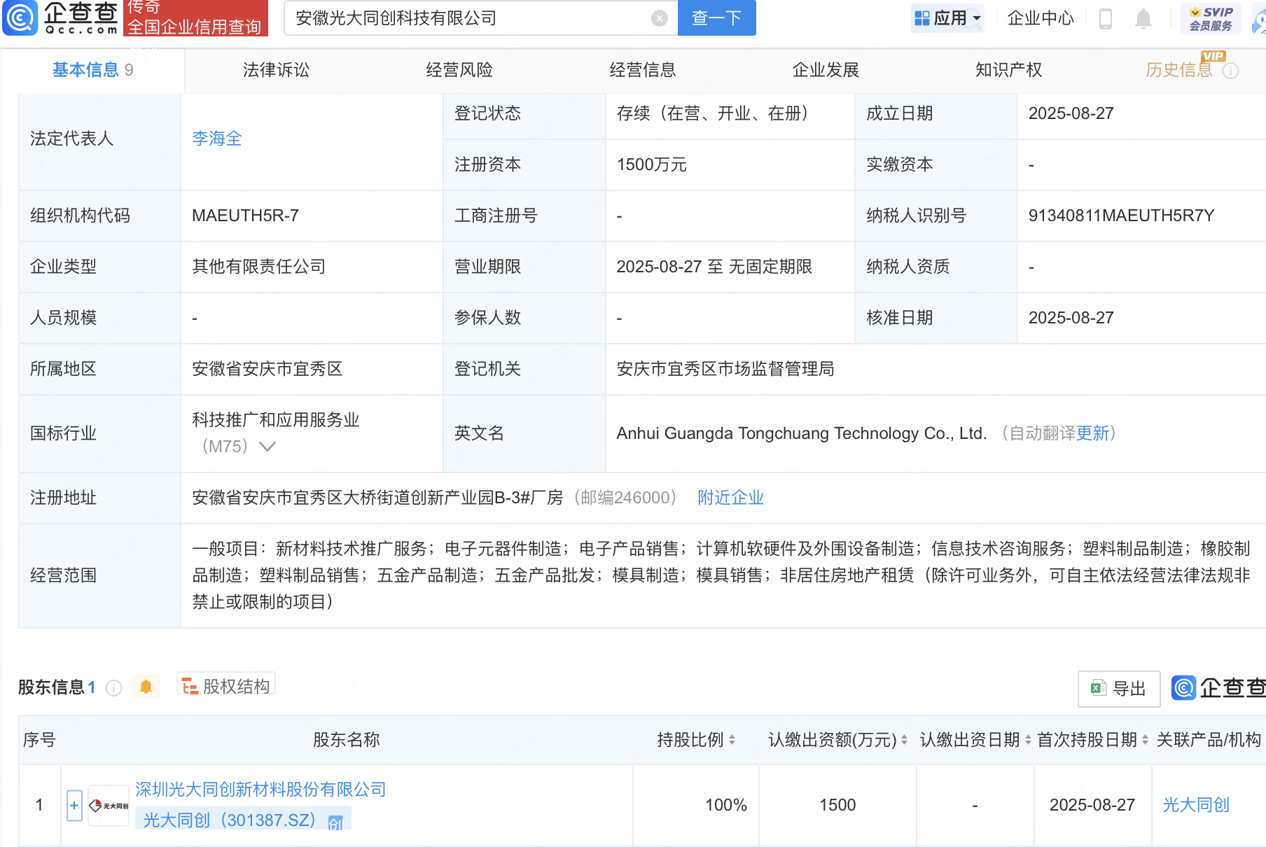 企查查APP显示,近日,安徽光大同创科技有限公司成立,注册资本1500万元,经营范围包含:新材料技术推广服务;电子元器件制造;电子产品销售;计算机软硬件及外围设备制造等。企查查股权穿透显示,该公司由光大同创(301387)全资持股。