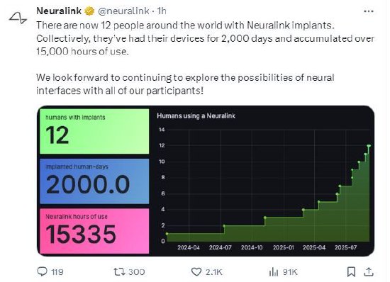 Neuralink称已有12人植入其脑机芯片,累计使用超1.5万小时