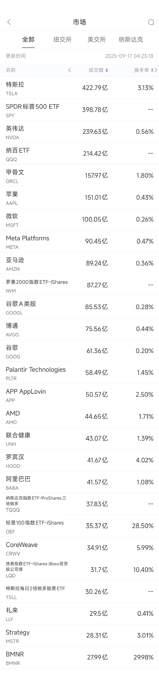 周二美股成交额第1名特斯拉收高2.82%,成交422.79亿美元。特斯拉9月15日提交至美国证券交易委员会的文件显示,公司CEO马斯克于9月12日买入超250万股特斯拉股票,总价值约10亿美元。