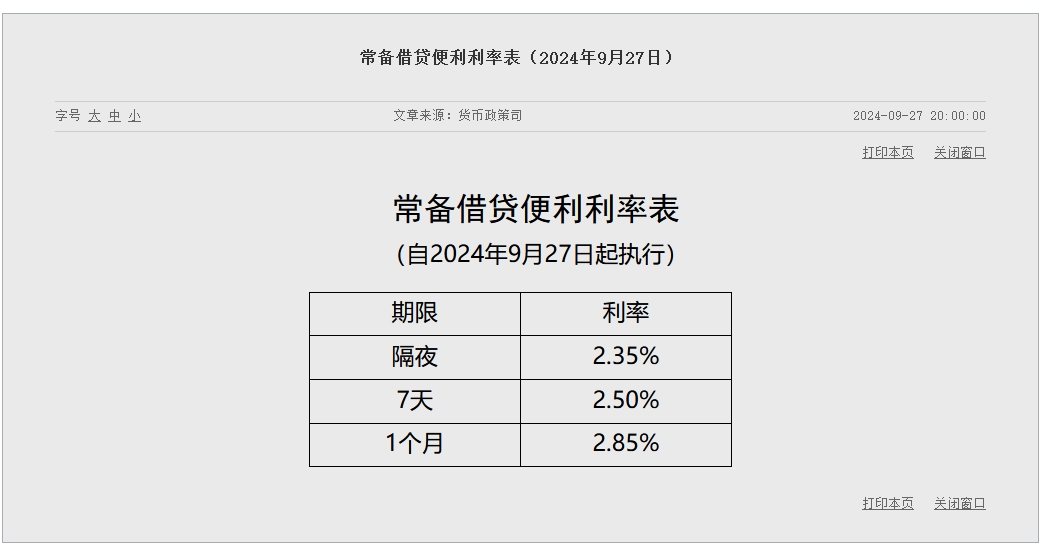 9月27日金融一线消息,央行发布公告下调常备借贷便利利率,将隔夜、7天、1个月常备借贷便利利率分别调整为2.35%、2.50%、2.85%。