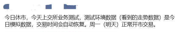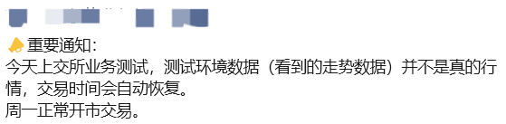 《每日经济新闻》记者注意到,今日多位券商财富管理条线人士在朋友圈发布通知:“今天上交所业务测试,测试环境数据(看到的走势数据)并不是真的行情,交易时间会自动恢复。”