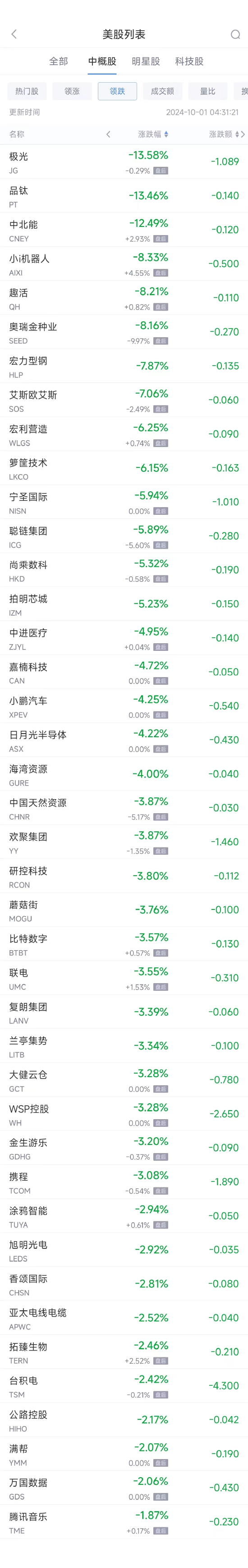 美股周一小幅收高。三大股指在9月份和第三季度均录得涨幅。美联储主席鲍威尔暗示将来不会激进降息,使交易员下调对美联储总体降息幅度的押注。中概股在9月份表现强劲,纳斯达克中国金龙指数当月上涨约30%。