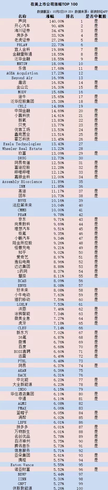 周三美股盘前涨幅前100只个股中,中概股占比68%,其中涨幅前10个股中概股占八只,涨幅前五更全被中概股占据。