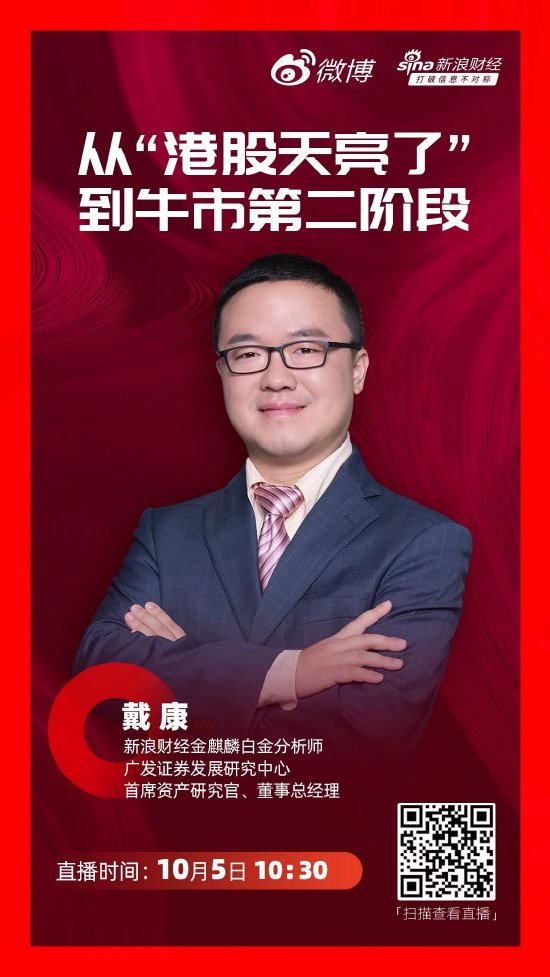 A股、港股迎来爆发式上涨,全球资本看多呼声高企,十一假期港股史诗级暴涨,10月5日10:30新浪财经金麒麟白金分析师、广发证券发展研究中心董事总经理、首席资产研究官戴康,直播分享主题:港股从天亮了到牛市第二阶段。查看直播