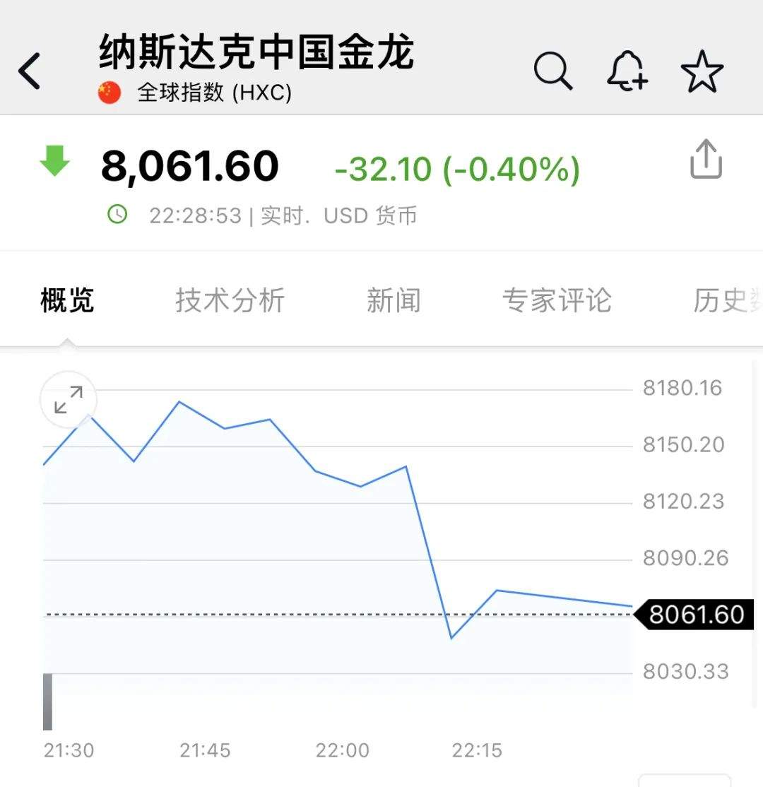 纳斯达克中国金龙指数高开后转跌,现跌0.4%。??