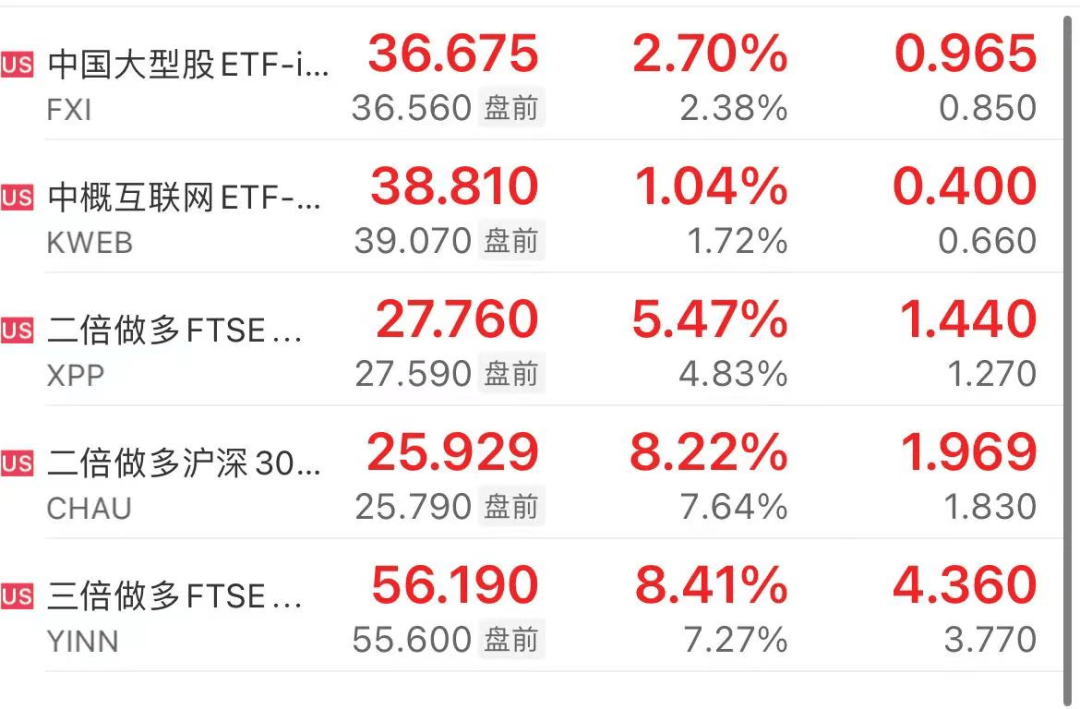 中国资产ETF开盘走高,截至发稿,三倍做多富时中国ETF-Direxion、二倍做多沪深300ETF-Direxion涨超8%,二倍做多富时中国50ETF-ProShares涨超5%,中概互联网ETF-kraneshares涨超1%,中国大型股ETF-iShares涨超2%。