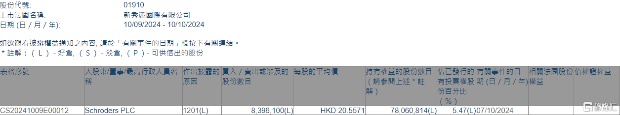 格隆汇10月10日丨根据联交所最新权益披露资料显示,2024年10月7日,新秀丽(01910.HK)遭Schroders PLC在场内以每股均价20.5571港元减持839.61万股,涉资约1.73亿港元。