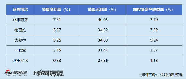 报告期内,漱玉平民销售毛利率为27.86%,同比下降约3个百分点,创下历史新低。加权平均净资产收益率为1.13%,同比大幅下降82.51%。横向对比来看,五家头部线下药店上市公司中,漱玉平民毛利率、净利率、加权净资产收益率均处于垫底位置。
