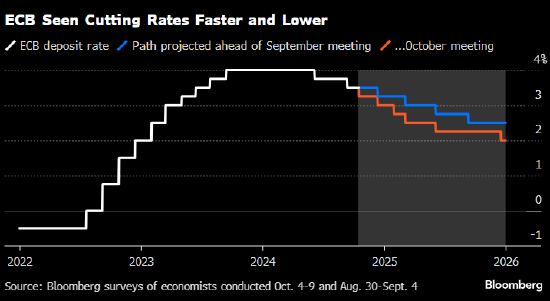 接受彭博调查的分析师一致预测,距离上次降息仅五周后,欧洲央行周四将再下调存款利率25个基点至3.25%。
