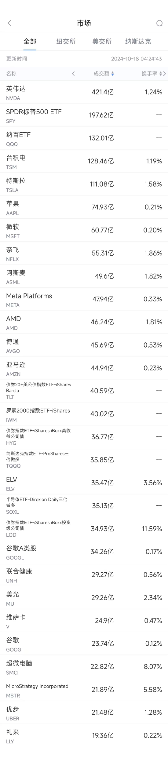 10月17日美股成交额前20:台积电业绩大超预期,市值突破1万亿美元