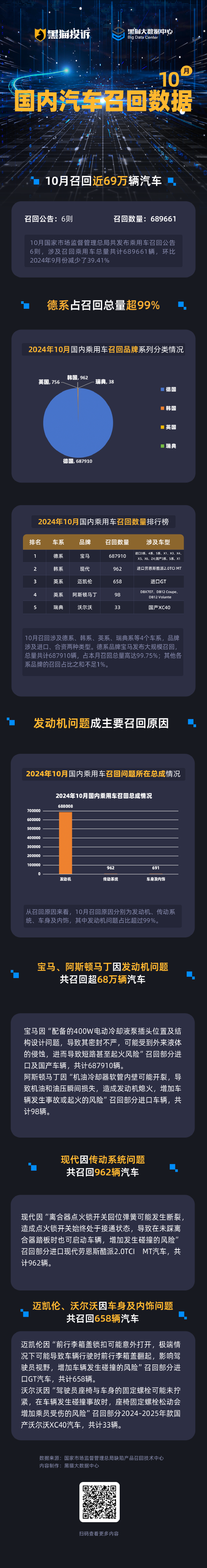 10月国家市场监督管理总局共发布乘用车召回公告6则,涉及召回乘用车总量共计689661辆,环比2024年9月份减少了39.41%。