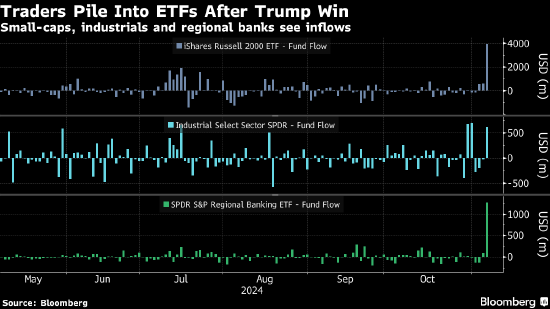 资金流主要反映“特朗普交易”,即押注这位当选总统将放松对银行和加密货币等行业的监管立场,支持那些业务大多在美国境内的公司。