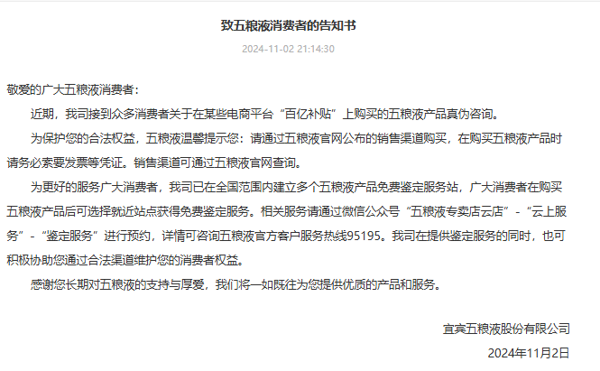 为了维护官方渠道,五粮液在11月2日发布消费者告知书,称公司接到众多消费者关于在某些电商平台“百亿补贴”上购买的五粮液产品真伪咨询,基于此提示消费者通过五粮液官网公布的销售渠道购买相关产品,并在购买五粮液产品时务必索要发票等凭证,相关销售渠道则可通过官网查询。
