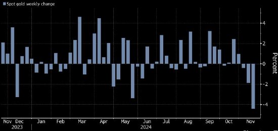 随着交易员对美联储下月降息的预期降温,黄金周五接近两个月低点,本周创下2021年6月以来最大跌幅。现货黄金下跌0.12%,报2561.72美元/盎司,已连续六个交易日下跌,本周累计下跌4.58%。黄金已从10月31日创下的纪录高位下跌约8%,在特朗普上周赢得大选后,金价加速下跌。一项美元指数已升至两年高点,市场预期特朗普的总统任期将提振经济增长和企业利润。对多数买家来说,美元上涨会令以美元计价的大宗商品变得更贵。尽管如此,金价今年仍涨逾24%,美联储的宽松周期、央行的购买行动、以及推动避险需求的地缘政治和经济风险上升,支撑了金价上涨。