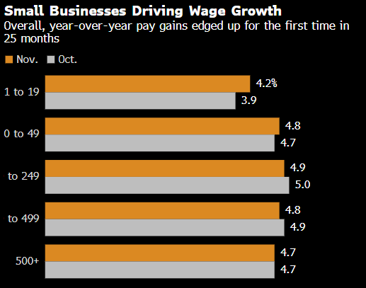 ADP Research Institute公布的数据显示,11月美国规模最小企业的工资增长速度出现了去年初以来首次加快。