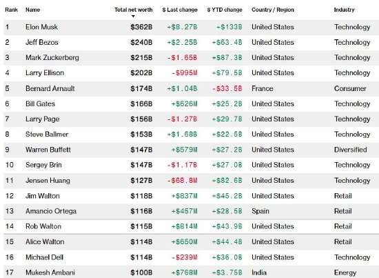 目前彭博亿万富翁指数上财富超过1000亿美元的富豪共有17位,其中10位是美国科技富豪。