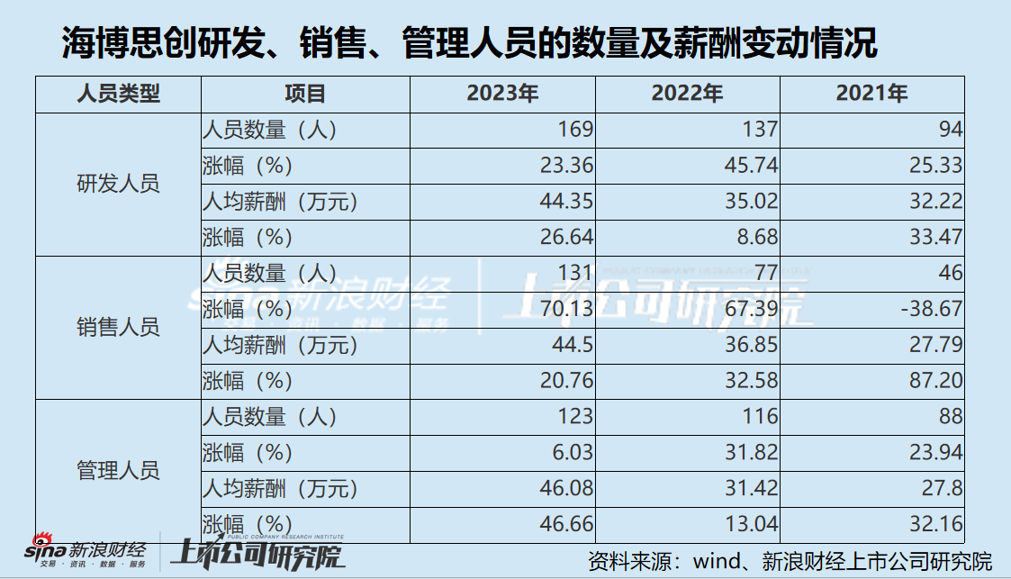 2021年至今年上半年,海博思创研发人员数量分别为94人、137人、169人和254人,占员工总数的比例分别为27.33%、35.96%、25.57%和28.64%。2021年至2023年,公司研发人员的人均薪酬及涨幅明均显低于销售人员和管理人员。