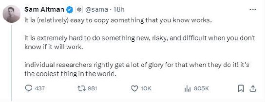奥特曼在社交平台X上发帖称:“复制你知道行得通的东西是(相对)容易的。当你不知道它是否行得通时,做一些新的、有风险的、困难的事情是非常困难的。当个人研究人员这样做的时候,他们理所当然地得到了很多荣誉!这是世界上最酷的事情。”