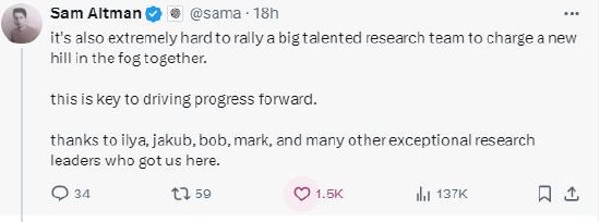 他补充称:“召集一支有才能的大型研究团队一起在迷雾中攻克一座新山峰也是极其困难的。这是推动进步的关键。感谢伊利亚、雅各布、鲍勃、马克,还有许多其他杰出的研究领导者,他们让我们来到这里。”