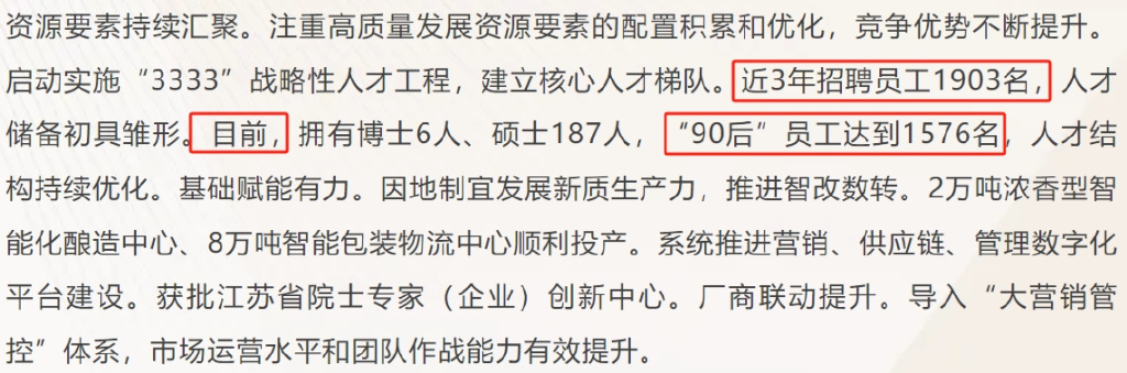 该文援引公司董事长、总经理顾祥悦所作的报告透露:今世缘酒业近3年招聘员工1903名……目前……“90后”员工达到1576名。