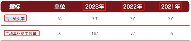 据今世缘酒业2023年ESG报告,过去三年(2021-2023年),它的员工流失率分别是2.6%、2.6%、3.7%,对应的“主动离职员工数量”分别是95人、77人、167人。