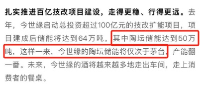 而一年前,在南京,由今世缘冠名的“苏商先进制造业发展峰会”上,顾祥悦的话术是——未来今世缘陶坛储能达到50万吨,“将仅次于茅台”。