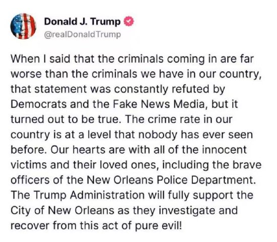 特朗普就新奥尔良事件发声 将其与非法移民罪犯联系在一起