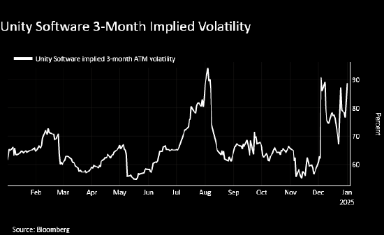 该帖最初提振了股票代码为U的Unity软件的股价,同时,Unity看涨期权成交量上升,以1月17日到期、执行价为60美元和40美元的期权为首,随着交易员押注该股进一步上涨,隐含波动率上升,期权总成交量已经高于过去一个月的日均值。
