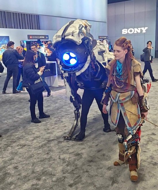 在索尼展台,有员工Cosplay《地平线:零之曙光》的主角与机械兽“逛展”,引发上百人围观。