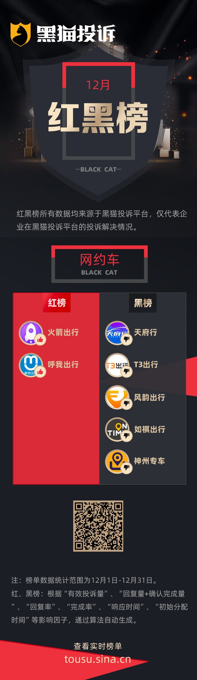 12月黑猫投诉网约车领域红黑榜:T3出行司机乘人之危索要高价洗车费