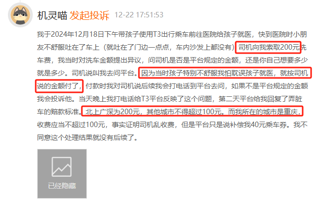 在本月中有用户向黑猫投诉平台反馈称,使用T3出行打车送孩子就医的途中,因小朋友不舒服吐在了车门边一点被司机索要了200元洗车费,虽然对费用持质疑态度但给孩子看病要紧便支付了。事后咨询平台才得知,弄脏车辆的赔付标准为“北上广深200元、其余城市100元”,因用户身处重庆固费用应为100元,证明司机存在漫天要价的情况,但平台针对此事件也仅给出了40元乘车券的补偿方案。在本月中T3出行累计投诉674单,回复率仅为27.74%