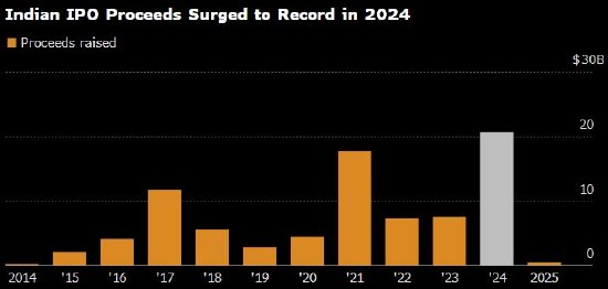 印度最新上市的股票顶住了该国更大范围的市场抛售,这表明首次公开募股仍有继续牛市的空间。数据显示,今年迄今为止在印度上市的23只股票平均较发行价上涨了15%。相比之下,基准的印度国家证券交易所(NSE) Nifty 50指数今年下跌了2%以上。印度股市去年的强劲反弹已遭遇挫折,由于市场担心经济和盈利增长放缓,Nifty 50指数遭遇2001年以来最严重的月度下跌。不过,新股发行的需求依然强劲,印度证监会表示,目前正在处理60多宗IPO申请。孟买JM金融机构证券有限公司的董事总经理兼股票资本市场主管Neha Agarwal说:“新的上市将继续出现。我认为你不会看到这方面的回落,因为国内投资者非常有信心。”Agarwal估计,今年印度的首次公开募股将筹集250亿至300亿美元,超过2024年创下的近210亿美元的筹资纪录。她补充说,企业通过直接向机构出售股票筹集的资金也将超过去年的总额。