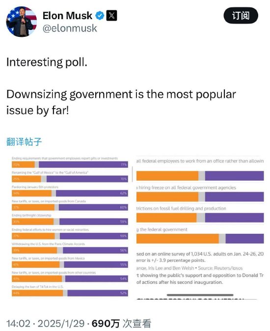 美国新政府效率部部长马斯克在评论路透社和益普索咨询公司进行的民调结果时表示,美国人支持缩减美国政府的官员规模。
